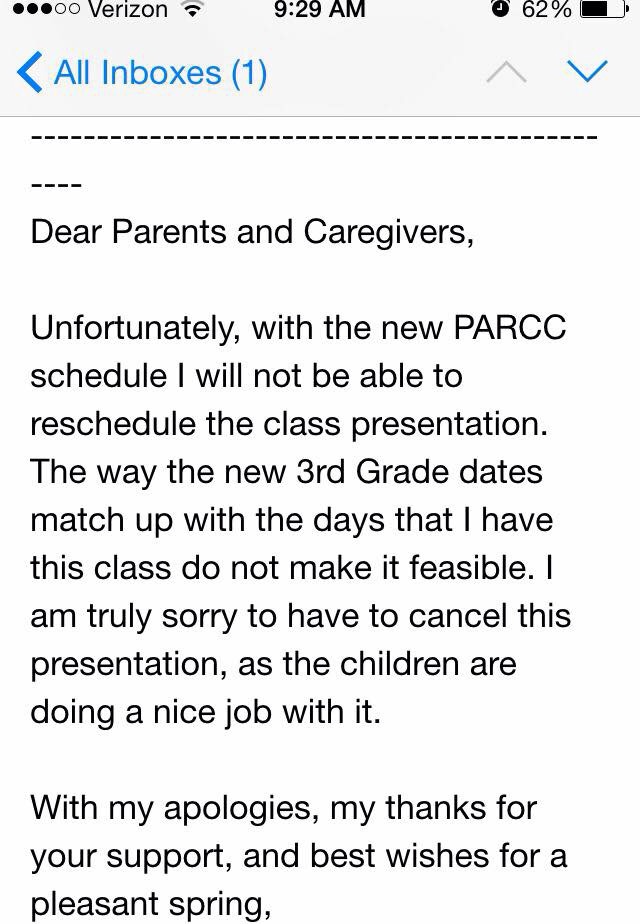 One Clarification: It is true that a third-grade theater class’s production was originally canceled due to PARCC. See this excerpt from an email to parents of the affected children regarding this decision: